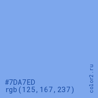 Цвет #7DA7ED в цветовой модели RGB обозначается тремя октетами (125, 167, 237) в десятичном формате и #7DA7ED в шестнадцатиричном (hex) формате, которые являются интенсивностью красного 125 (hex 7D), интенсивность зелёного 167 (hex A7) и интенсивность синего 237 (hex ED).