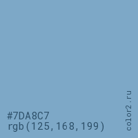 Цвет #7DA8C7 в цветовой модели RGB обозначается тремя октетами (125, 168, 199) в десятичном формате и #7DA8C7 в шестнадцатиричном (hex) формате, которые являются интенсивностью красного 125 (hex 7D), интенсивность зелёного 168 (hex A8) и интенсивность синего 199 (hex C7).