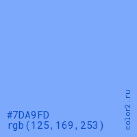 Цвет #7DA9FD в цветовой модели RGB обозначается тремя октетами (125, 169, 253) в десятичном формате и #7DA9FD в шестнадцатиричном (hex) формате, которые являются интенсивностью красного 125 (hex 7D), интенсивность зелёного 169 (hex A9) и интенсивность синего 253 (hex FD).