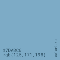 Цвет #7DABC6 в цветовой модели RGB обозначается тремя октетами (125, 171, 198) в десятичном формате и #7DABC6 в шестнадцатиричном (hex) формате, которые являются интенсивностью красного 125 (hex 7D), интенсивность зелёного 171 (hex AB) и интенсивность синего 198 (hex C6).