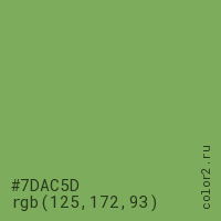 Цвет #7DAC5D в цветовой модели RGB обозначается тремя октетами (125, 172, 93) в десятичном формате и #7DAC5D в шестнадцатиричном (hex) формате, которые являются интенсивностью красного 125 (hex 7D), интенсивность зелёного 172 (hex AC) и интенсивность синего 93 (hex 5D).