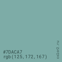 Цвет #7DACA7 в цветовой модели RGB обозначается тремя октетами (125, 172, 167) в десятичном формате и #7DACA7 в шестнадцатиричном (hex) формате, которые являются интенсивностью красного 125 (hex 7D), интенсивность зелёного 172 (hex AC) и интенсивность синего 167 (hex A7).