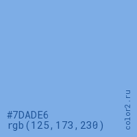 Цвет #7DADE6 в цветовой модели RGB обозначается тремя октетами (125, 173, 230) в десятичном формате и #7DADE6 в шестнадцатиричном (hex) формате, которые являются интенсивностью красного 125 (hex 7D), интенсивность зелёного 173 (hex AD) и интенсивность синего 230 (hex E6).