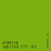 Цвет #7DB110 в цветовой модели RGB обозначается тремя октетами (125, 177, 16) в десятичном формате и #7DB110 в шестнадцатиричном (hex) формате, которые являются интенсивностью красного 125 (hex 7D), интенсивность зелёного 177 (hex B1) и интенсивность синего 16 (hex 10).