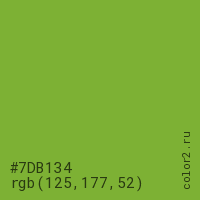 Цвет #7DB134 в цветовой модели RGB обозначается тремя октетами (125, 177, 52) в десятичном формате и #7DB134 в шестнадцатиричном (hex) формате, которые являются интенсивностью красного 125 (hex 7D), интенсивность зелёного 177 (hex B1) и интенсивность синего 52 (hex 34).