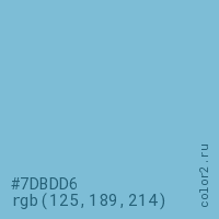 Цвет #7DBDD6 в цветовой модели RGB обозначается тремя октетами (125, 189, 214) в десятичном формате и #7DBDD6 в шестнадцатиричном (hex) формате, которые являются интенсивностью красного 125 (hex 7D), интенсивность зелёного 189 (hex BD) и интенсивность синего 214 (hex D6).