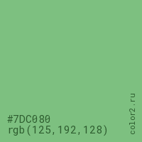 Цвет #7DC080 в цветовой модели RGB обозначается тремя октетами (125, 192, 128) в десятичном формате и #7DC080 в шестнадцатиричном (hex) формате, которые являются интенсивностью красного 125 (hex 7D), интенсивность зелёного 192 (hex C0) и интенсивность синего 128 (hex 80).