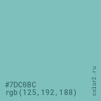 Цвет #7DC0BC в цветовой модели RGB обозначается тремя октетами (125, 192, 188) в десятичном формате и #7DC0BC в шестнадцатиричном (hex) формате, которые являются интенсивностью красного 125 (hex 7D), интенсивность зелёного 192 (hex C0) и интенсивность синего 188 (hex BC).