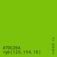 Цвет #7DC20A в цветовой модели RGB обозначается тремя октетами (125, 194, 10) в десятичном формате и #7DC20A в шестнадцатиричном (hex) формате, которые являются интенсивностью красного 125 (hex 7D), интенсивность зелёного 194 (hex C2) и интенсивность синего 10 (hex 0A).