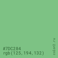 Цвет #7DC284 в цветовой модели RGB обозначается тремя октетами (125, 194, 132) в десятичном формате и #7DC284 в шестнадцатиричном (hex) формате, которые являются интенсивностью красного 125 (hex 7D), интенсивность зелёного 194 (hex C2) и интенсивность синего 132 (hex 84).