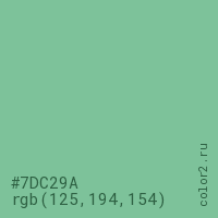 Цвет #7DC29A в цветовой модели RGB обозначается тремя октетами (125, 194, 154) в десятичном формате и #7DC29A в шестнадцатиричном (hex) формате, которые являются интенсивностью красного 125 (hex 7D), интенсивность зелёного 194 (hex C2) и интенсивность синего 154 (hex 9A).