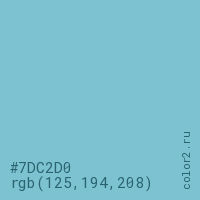 Цвет #7DC2D0 в цветовой модели RGB обозначается тремя октетами (125, 194, 208) в десятичном формате и #7DC2D0 в шестнадцатиричном (hex) формате, которые являются интенсивностью красного 125 (hex 7D), интенсивность зелёного 194 (hex C2) и интенсивность синего 208 (hex D0).