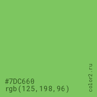 Цвет #7DC660 в цветовой модели RGB обозначается тремя октетами (125, 198, 96) в десятичном формате и #7DC660 в шестнадцатиричном (hex) формате, которые являются интенсивностью красного 125 (hex 7D), интенсивность зелёного 198 (hex C6) и интенсивность синего 96 (hex 60).