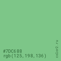 Цвет #7DC688 в цветовой модели RGB обозначается тремя октетами (125, 198, 136) в десятичном формате и #7DC688 в шестнадцатиричном (hex) формате, которые являются интенсивностью красного 125 (hex 7D), интенсивность зелёного 198 (hex C6) и интенсивность синего 136 (hex 88).