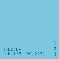 Цвет #7DC7DF в цветовой модели RGB обозначается тремя октетами (125, 199, 223) в десятичном формате и #7DC7DF в шестнадцатиричном (hex) формате, которые являются интенсивностью красного 125 (hex 7D), интенсивность зелёного 199 (hex C7) и интенсивность синего 223 (hex DF).