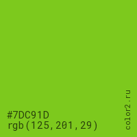 Цвет #7DC91D в цветовой модели RGB обозначается тремя октетами (125, 201, 29) в десятичном формате и #7DC91D в шестнадцатиричном (hex) формате, которые являются интенсивностью красного 125 (hex 7D), интенсивность зелёного 201 (hex C9) и интенсивность синего 29 (hex 1D).