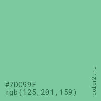 Цвет #7DC99F в цветовой модели RGB обозначается тремя октетами (125, 201, 159) в десятичном формате и #7DC99F в шестнадцатиричном (hex) формате, которые являются интенсивностью красного 125 (hex 7D), интенсивность зелёного 201 (hex C9) и интенсивность синего 159 (hex 9F).
