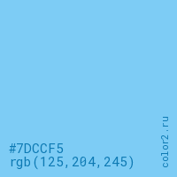 Цвет #7DCCF5 в цветовой модели RGB обозначается тремя октетами (125, 204, 245) в десятичном формате и #7DCCF5 в шестнадцатиричном (hex) формате, которые являются интенсивностью красного 125 (hex 7D), интенсивность зелёного 204 (hex CC) и интенсивность синего 245 (hex F5).