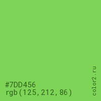 Цвет #7DD456 в цветовой модели RGB обозначается тремя октетами (125, 212, 86) в десятичном формате и #7DD456 в шестнадцатиричном (hex) формате, которые являются интенсивностью красного 125 (hex 7D), интенсивность зелёного 212 (hex D4) и интенсивность синего 86 (hex 56).