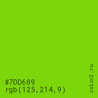 Цвет #7DD609 в цветовой модели RGB обозначается тремя октетами (125, 214, 9) в десятичном формате и #7DD609 в шестнадцатиричном (hex) формате, которые являются интенсивностью красного 125 (hex 7D), интенсивность зелёного 214 (hex D6) и интенсивность синего 9 (hex 09).