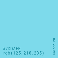 Цвет #7DDAEB в цветовой модели RGB обозначается тремя октетами (125, 218, 235) в десятичном формате и #7DDAEB в шестнадцатиричном (hex) формате, которые являются интенсивностью красного 125 (hex 7D), интенсивность зелёного 218 (hex DA) и интенсивность синего 235 (hex EB).