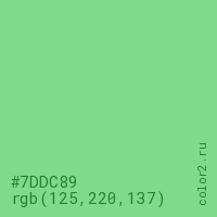 Цвет #7DDC89 в цветовой модели RGB обозначается тремя октетами (125, 220, 137) в десятичном формате и #7DDC89 в шестнадцатиричном (hex) формате, которые являются интенсивностью красного 125 (hex 7D), интенсивность зелёного 220 (hex DC) и интенсивность синего 137 (hex 89).