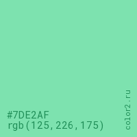 Цвет #7DE2AF в цветовой модели RGB обозначается тремя октетами (125, 226, 175) в десятичном формате и #7DE2AF в шестнадцатиричном (hex) формате, которые являются интенсивностью красного 125 (hex 7D), интенсивность зелёного 226 (hex E2) и интенсивность синего 175 (hex AF).