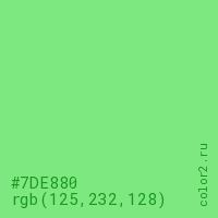 Цвет #7DE880 в цветовой модели RGB обозначается тремя октетами (125, 232, 128) в десятичном формате и #7DE880 в шестнадцатиричном (hex) формате, которые являются интенсивностью красного 125 (hex 7D), интенсивность зелёного 232 (hex E8) и интенсивность синего 128 (hex 80).