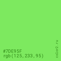 Цвет #7DE95F в цветовой модели RGB обозначается тремя октетами (125, 233, 95) в десятичном формате и #7DE95F в шестнадцатиричном (hex) формате, которые являются интенсивностью красного 125 (hex 7D), интенсивность зелёного 233 (hex E9) и интенсивность синего 95 (hex 5F).