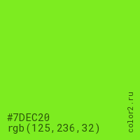 Цвет #7DEC20 в цветовой модели RGB обозначается тремя октетами (125, 236, 32) в десятичном формате и #7DEC20 в шестнадцатиричном (hex) формате, которые являются интенсивностью красного 125 (hex 7D), интенсивность зелёного 236 (hex EC) и интенсивность синего 32 (hex 20).