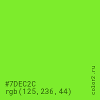 Цвет #7DEC2C в цветовой модели RGB обозначается тремя октетами (125, 236, 44) в десятичном формате и #7DEC2C в шестнадцатиричном (hex) формате, которые являются интенсивностью красного 125 (hex 7D), интенсивность зелёного 236 (hex EC) и интенсивность синего 44 (hex 2C).