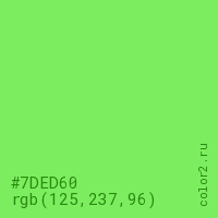Цвет #7DED60 в цветовой модели RGB обозначается тремя октетами (125, 237, 96) в десятичном формате и #7DED60 в шестнадцатиричном (hex) формате, которые являются интенсивностью красного 125 (hex 7D), интенсивность зелёного 237 (hex ED) и интенсивность синего 96 (hex 60).