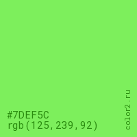 Цвет #7DEF5C в цветовой модели RGB обозначается тремя октетами (125, 239, 92) в десятичном формате и #7DEF5C в шестнадцатиричном (hex) формате, которые являются интенсивностью красного 125 (hex 7D), интенсивность зелёного 239 (hex EF) и интенсивность синего 92 (hex 5C).