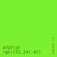 Цвет #7DF12F в цветовой модели RGB обозначается тремя октетами (125, 241, 47) в десятичном формате и #7DF12F в шестнадцатиричном (hex) формате, которые являются интенсивностью красного 125 (hex 7D), интенсивность зелёного 241 (hex F1) и интенсивность синего 47 (hex 2F).