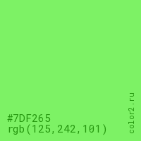 Цвет #7DF265 в цветовой модели RGB обозначается тремя октетами (125, 242, 101) в десятичном формате и #7DF265 в шестнадцатиричном (hex) формате, которые являются интенсивностью красного 125 (hex 7D), интенсивность зелёного 242 (hex F2) и интенсивность синего 101 (hex 65).