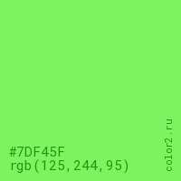 Цвет #7DF45F в цветовой модели RGB обозначается тремя октетами (125, 244, 95) в десятичном формате и #7DF45F в шестнадцатиричном (hex) формате, которые являются интенсивностью красного 125 (hex 7D), интенсивность зелёного 244 (hex F4) и интенсивность синего 95 (hex 5F).