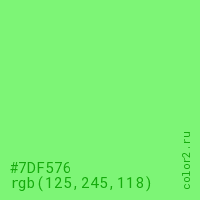 Цвет #7DF576 в цветовой модели RGB обозначается тремя октетами (125, 245, 118) в десятичном формате и #7DF576 в шестнадцатиричном (hex) формате, которые являются интенсивностью красного 125 (hex 7D), интенсивность зелёного 245 (hex F5) и интенсивность синего 118 (hex 76).