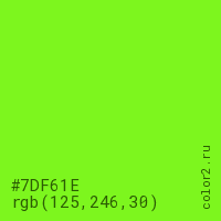 Цвет #7DF61E в цветовой модели RGB обозначается тремя октетами (125, 246, 30) в десятичном формате и #7DF61E в шестнадцатиричном (hex) формате, которые являются интенсивностью красного 125 (hex 7D), интенсивность зелёного 246 (hex F6) и интенсивность синего 30 (hex 1E).