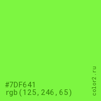 Цвет #7DF641 в цветовой модели RGB обозначается тремя октетами (125, 246, 65) в десятичном формате и #7DF641 в шестнадцатиричном (hex) формате, которые являются интенсивностью красного 125 (hex 7D), интенсивность зелёного 246 (hex F6) и интенсивность синего 65 (hex 41).