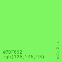Цвет #7DF662 в цветовой модели RGB обозначается тремя октетами (125, 246, 98) в десятичном формате и #7DF662 в шестнадцатиричном (hex) формате, которые являются интенсивностью красного 125 (hex 7D), интенсивность зелёного 246 (hex F6) и интенсивность синего 98 (hex 62).