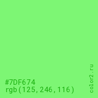 Цвет #7DF674 в цветовой модели RGB обозначается тремя октетами (125, 246, 116) в десятичном формате и #7DF674 в шестнадцатиричном (hex) формате, которые являются интенсивностью красного 125 (hex 7D), интенсивность зелёного 246 (hex F6) и интенсивность синего 116 (hex 74).