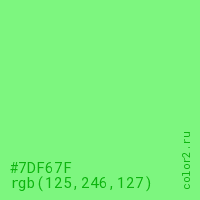 Цвет #7DF67F в цветовой модели RGB обозначается тремя октетами (125, 246, 127) в десятичном формате и #7DF67F в шестнадцатиричном (hex) формате, которые являются интенсивностью красного 125 (hex 7D), интенсивность зелёного 246 (hex F6) и интенсивность синего 127 (hex 7F).