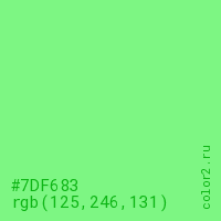 Цвет #7DF683 в цветовой модели RGB обозначается тремя октетами (125, 246, 131) в десятичном формате и #7DF683 в шестнадцатиричном (hex) формате, которые являются интенсивностью красного 125 (hex 7D), интенсивность зелёного 246 (hex F6) и интенсивность синего 131 (hex 83).