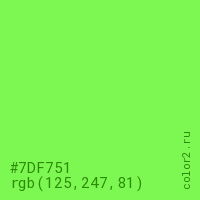 Цвет #7DF751 в цветовой модели RGB обозначается тремя октетами (125, 247, 81) в десятичном формате и #7DF751 в шестнадцатиричном (hex) формате, которые являются интенсивностью красного 125 (hex 7D), интенсивность зелёного 247 (hex F7) и интенсивность синего 81 (hex 51).