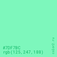 Цвет #7DF7BC в цветовой модели RGB обозначается тремя октетами (125, 247, 188) в десятичном формате и #7DF7BC в шестнадцатиричном (hex) формате, которые являются интенсивностью красного 125 (hex 7D), интенсивность зелёного 247 (hex F7) и интенсивность синего 188 (hex BC).