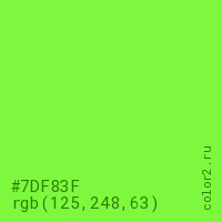 Цвет #7DF83F в цветовой модели RGB обозначается тремя октетами (125, 248, 63) в десятичном формате и #7DF83F в шестнадцатиричном (hex) формате, которые являются интенсивностью красного 125 (hex 7D), интенсивность зелёного 248 (hex F8) и интенсивность синего 63 (hex 3F).