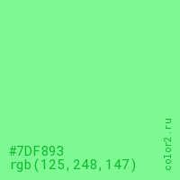Цвет #7DF893 в цветовой модели RGB обозначается тремя октетами (125, 248, 147) в десятичном формате и #7DF893 в шестнадцатиричном (hex) формате, которые являются интенсивностью красного 125 (hex 7D), интенсивность зелёного 248 (hex F8) и интенсивность синего 147 (hex 93).