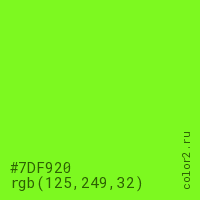 Цвет #7DF920 в цветовой модели RGB обозначается тремя октетами (125, 249, 32) в десятичном формате и #7DF920 в шестнадцатиричном (hex) формате, которые являются интенсивностью красного 125 (hex 7D), интенсивность зелёного 249 (hex F9) и интенсивность синего 32 (hex 20).