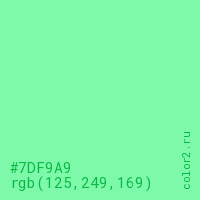 Цвет #7DF9A9 в цветовой модели RGB обозначается тремя октетами (125, 249, 169) в десятичном формате и #7DF9A9 в шестнадцатиричном (hex) формате, которые являются интенсивностью красного 125 (hex 7D), интенсивность зелёного 249 (hex F9) и интенсивность синего 169 (hex A9).