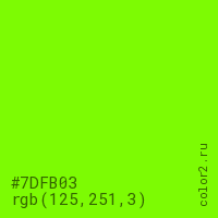 Цвет #7DFB03 в цветовой модели RGB обозначается тремя октетами (125, 251, 3) в десятичном формате и #7DFB03 в шестнадцатиричном (hex) формате, которые являются интенсивностью красного 125 (hex 7D), интенсивность зелёного 251 (hex FB) и интенсивность синего 3 (hex 03).